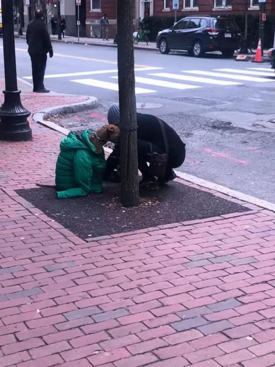 “Είχε πολύ κρύο και αέρα έξω”, δήλωσε η Hollie στο The Dodo. “Παρατήρησα ότι έτρεμε εμφανώς. Προφανώς το πρόσεξε και εκείνη, γιατί αμέσως έβγαλε το μπουφάν της και σκέπασε τον σκύλο καθώς καθόταν. Ίσως σκέφτηκε ότι θα το κλωτσούσε, οπότε έσκυψε και το έκλεισε γύρω του με το φερμουάρ!”