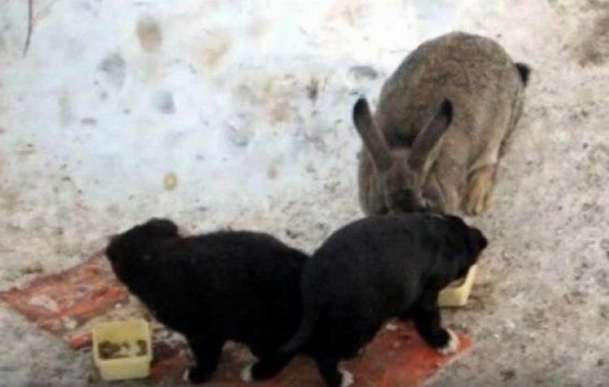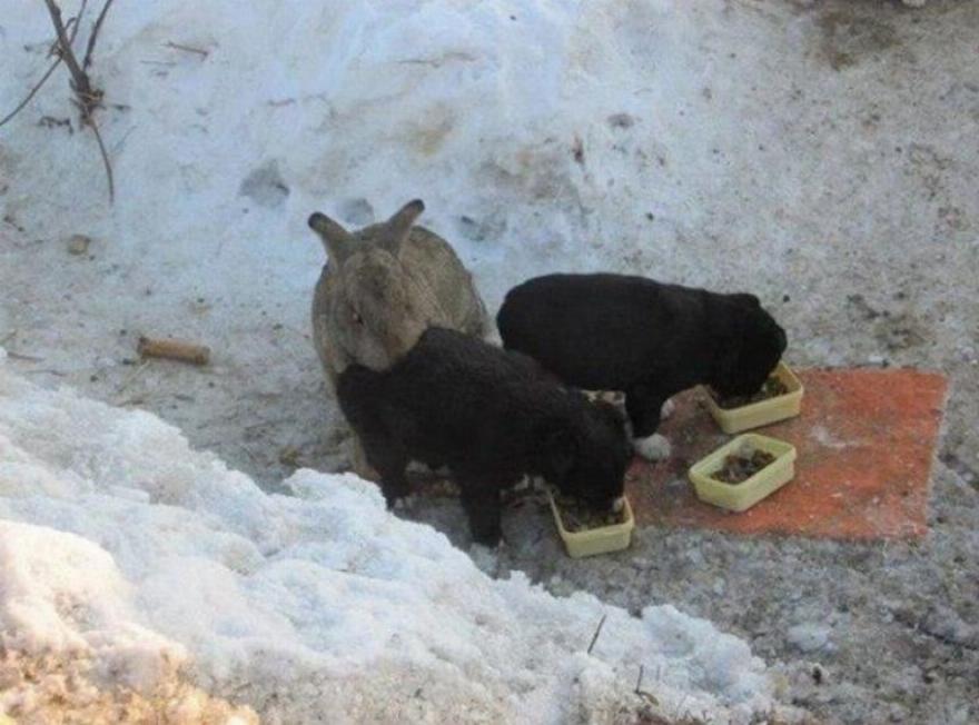 Ο κάτοικος άρχισε να φέρνει τροφή για τα ζώα, και παρότι το κουνέλι αρχικά ήταν προστατευτικό, τελικά τον άφησε να ταΐσει τα κουτάβια. Το κουνέλι τα ζέσταινε και τα καθάριζε, σώζοντάς τα από τον παγετό που διαφορετικά θα τα σκότωνε.