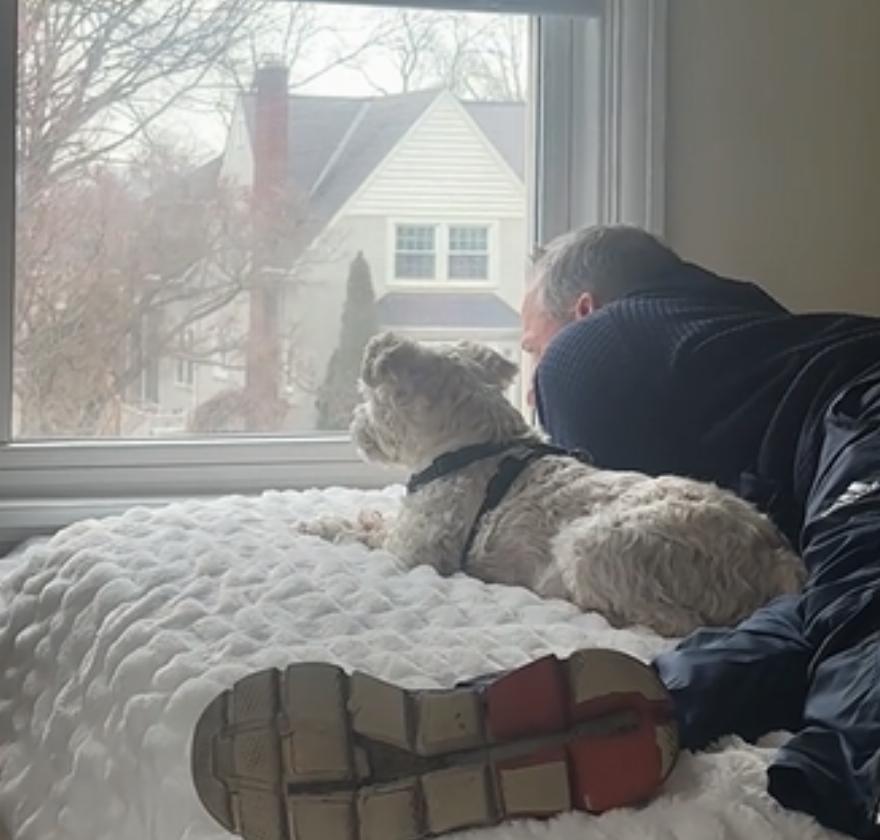 Η ανάρτηση συνοδεύεται από μια λεζάντα που λέει: “Η αδελφή μου επέστρεψε στο κολέγιο σήμερα το πρωί και ο σκύλος μας δεν φεύγει από το δωμάτιό της, οπότε ο μπαμπάς μου κάνει παρέα μαζί του”.