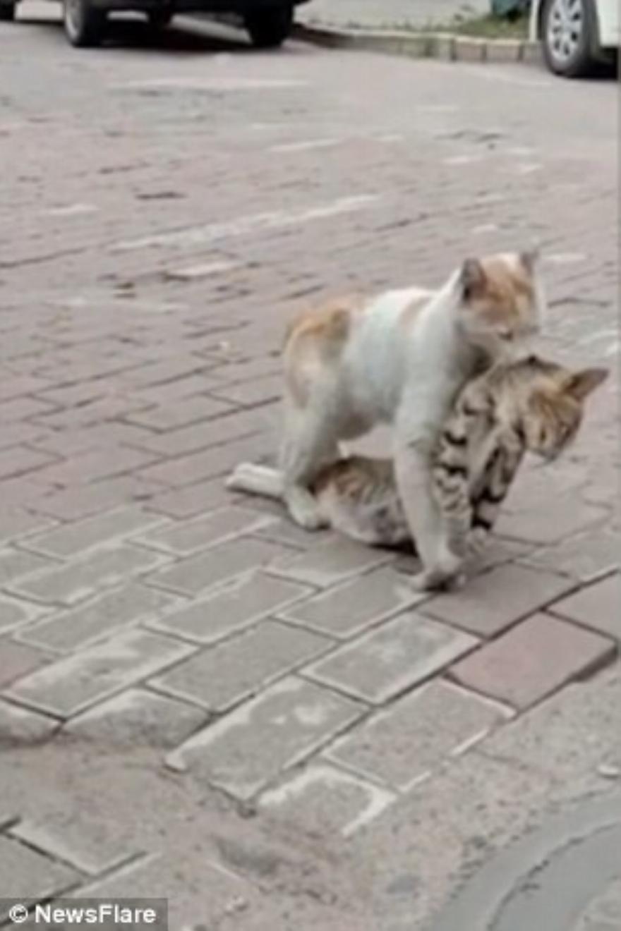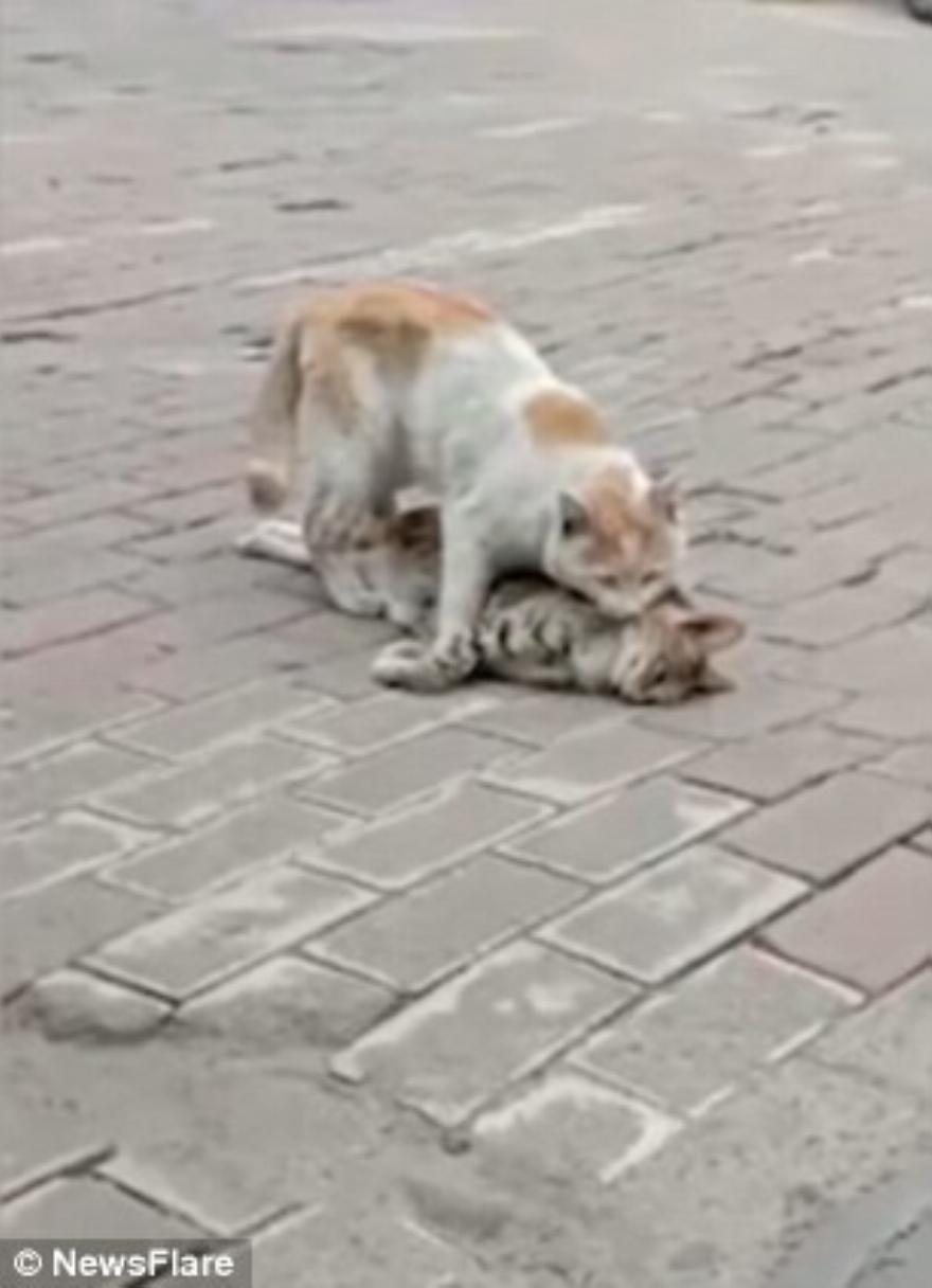 Μια αδέσποτη γάτα παρέσυρε τον σύντροφό του, ο οποίος είχε πεθάνει από κάποια ασθένεια, τον δάγκωσε στο λαιμό και τον μετέφερε στο πεζοδρόμιο. Το αφοσιωμένο ζωάκι δεν ήθελε να αφήσει τον φίλο του, πήρε το σώμα του και κρύφτηκε κάτω από το αυτοκίνητο σε ασφαλές μέρος.