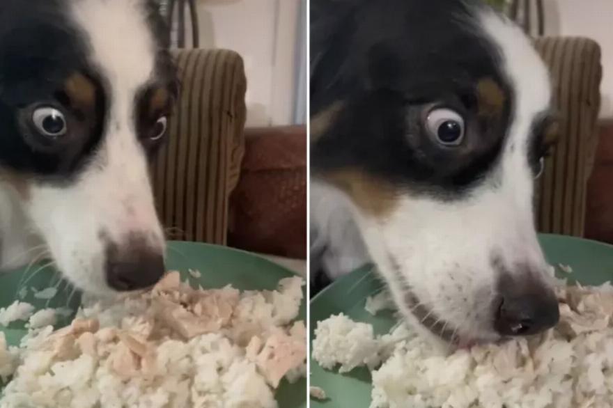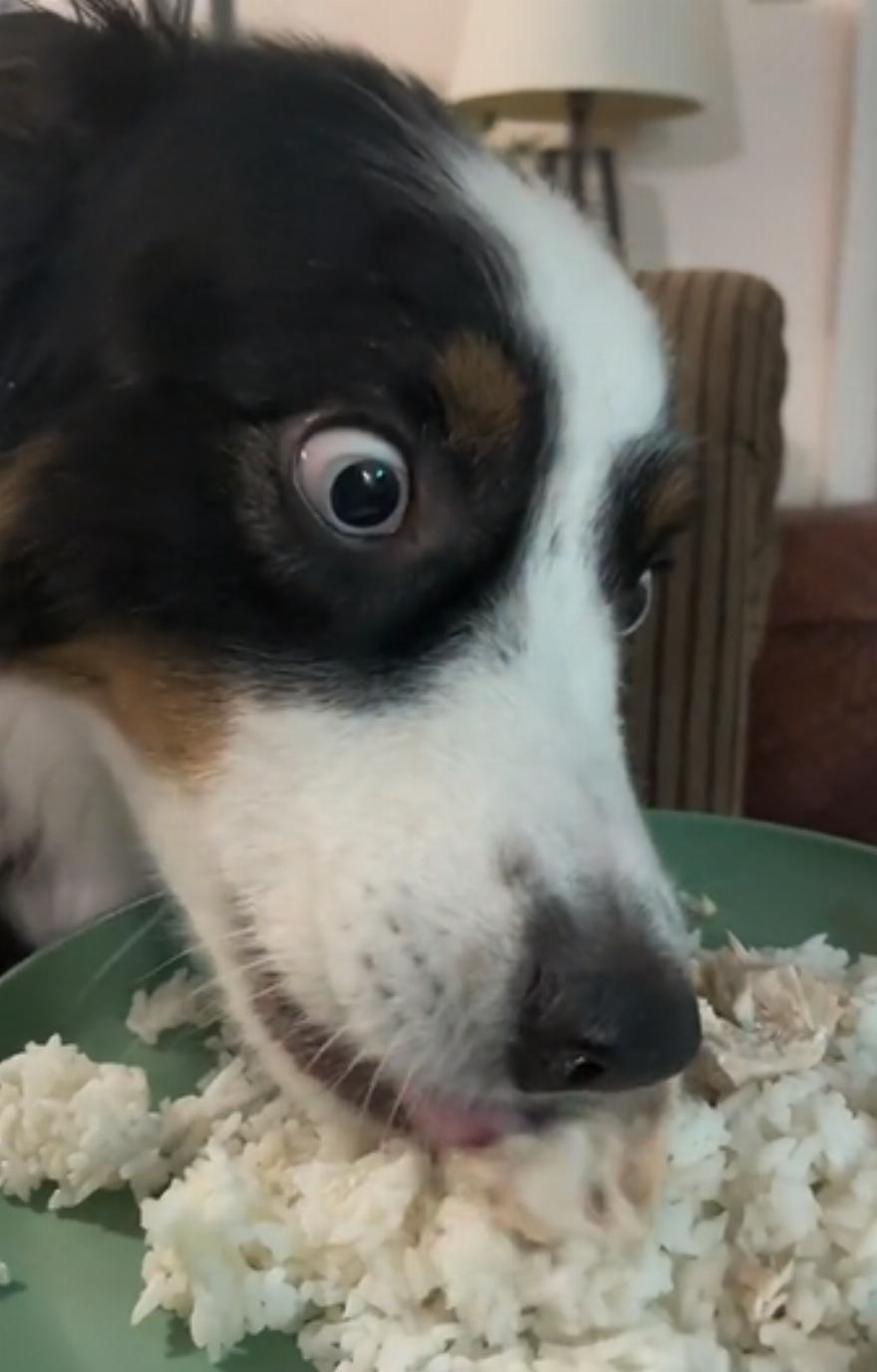 Αφού έφτιαξε το απλό γεύμα με κοτόπουλο και ρύζι, η Fuhs το πρόσφερε στον σκύλο και εκείνος ενθουσιάστηκε