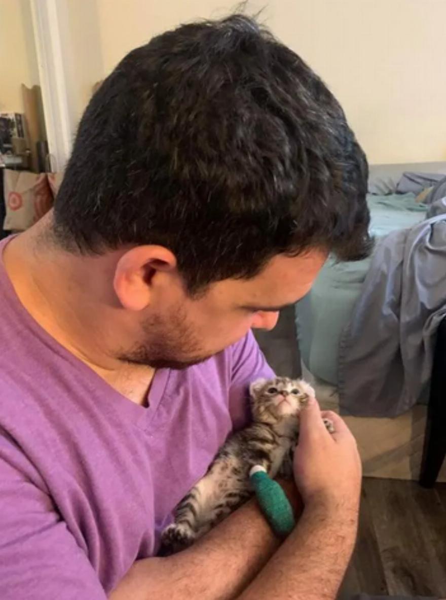 Ο Adam και η Margaux, ανάδοχοι εθελοντές της διάσωσης, τάιζαν με σύριγγα το γατάκι κατά τη διάρκεια της ημέρας και ήταν πολύ ερωτευμένοι με το μικρό tabby.