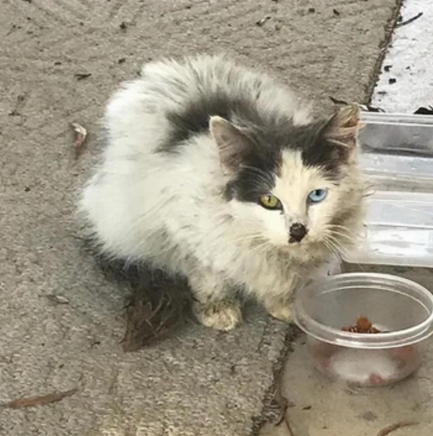 Η Betty H. και ο σύζυγός της παρατήρησαν ένα αδέσποτο να περιφέρεται έξω από το σπίτι τους. Το μικρό γατάκι με τα περίεργα μάτια ήταν ντροπαλό, βρώμικο και πολύ πεινασμένο. “Αρχίσαμε να της αφήνουμε φαγητό και νερό για να τη βοηθήσουμε”, είπε η Betty.