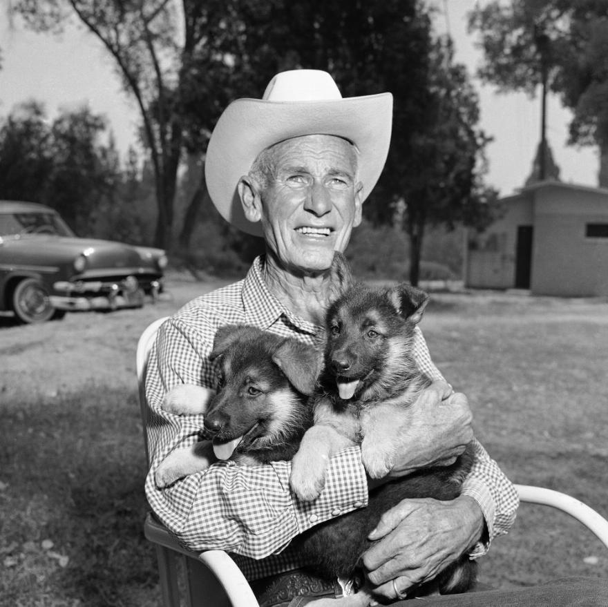 Lee Duncan, 67, holds a pair of Rin Tin Tin’s descendants, Rin Tin Tin 5 and 6, in 1958.