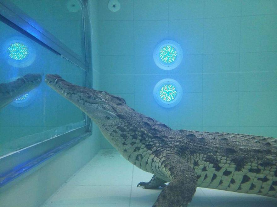 Όπως λέει εκείνος με βάση τη δική του προσωπική εμπειρία, το νερό τους πρέπει να έχει μια συγκεκριμένη θερμοκρασία. “Η πισίνα διαθέτει ειδικά φίλτρα και τρία συστήματα προστασίας, ώστε η θερμοκρασία να διατηρείται σταθερή στους 28 βαθμούς”, επισημαίνει λέγοντας πως ο κροκόδειλος του είναι γεννημένος σε αιχμαλωσία.