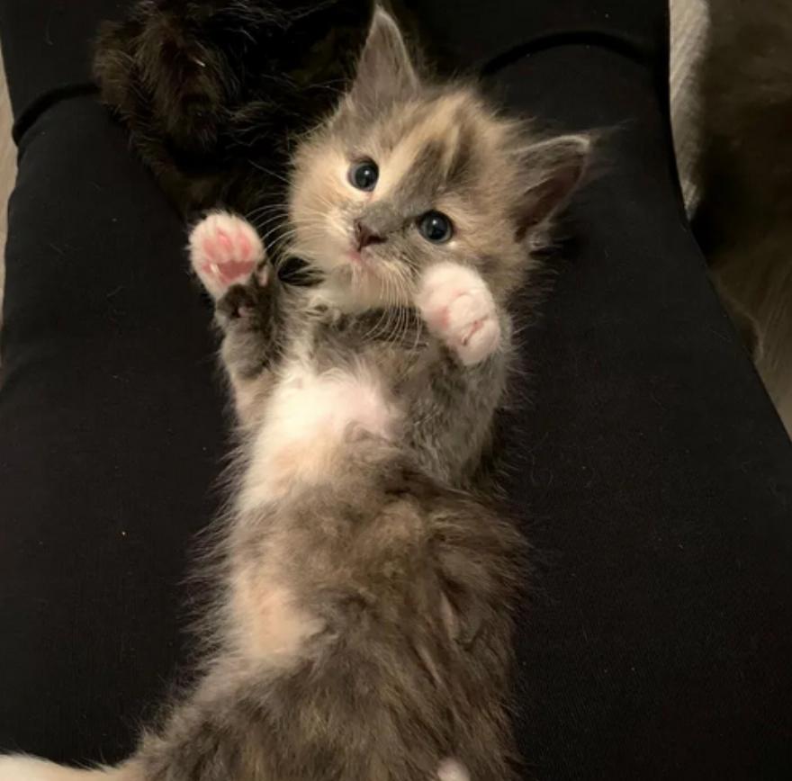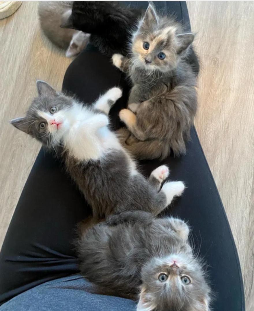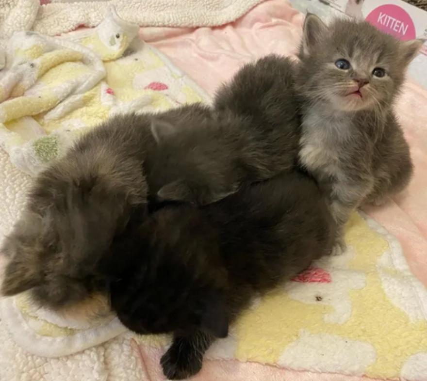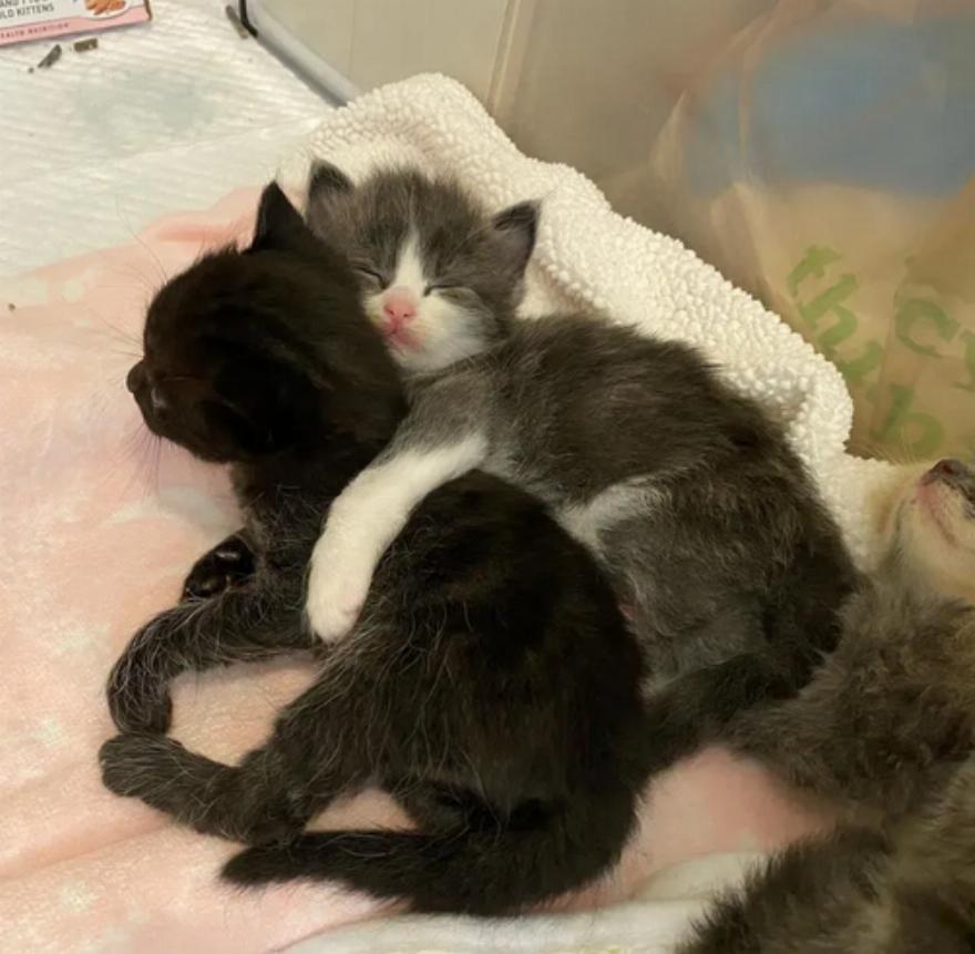 Τα γατάκια ήταν περίπου τριών εβδομάδων και ήταν πολύ αδύνατα. Από την πρώτη μέρα ήταν μια ομάδα, που παρηγορούσαν το ένα το άλλο κατά τη διάρκεια του ταξιδιού.