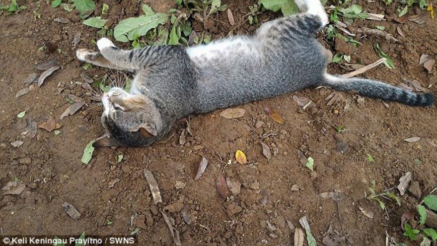 Ο περαστικός Keli Keningau Prayitno, 28 ετών, προσπάθησε να υιοθετήσει τη γάτα, αλλά εκείνη επέστρεψε στο ίδιο σημείο – γλύφοντας τη μικρή μπλε ταφόπλακα.