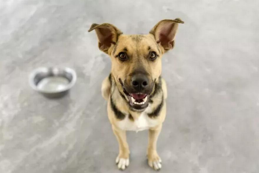 Ο μικρότερος σκύλος πηδάει και χοροπηδάει προτού βάλει το πόδι του σε ένα μπολ με φαγητό
