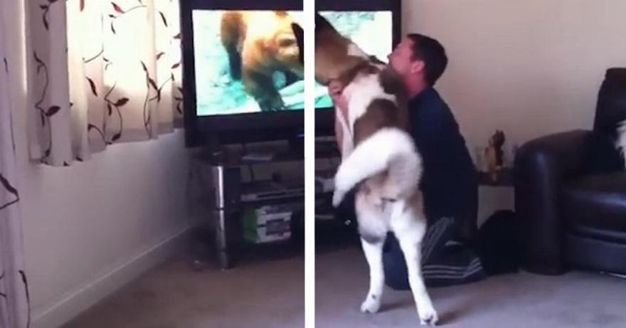Οικογενειακός σκύλος προσπαθεί να προστατεύσει τον ιδιοκτήτη του από μια αρκούδα που είδε στην τηλεόραση