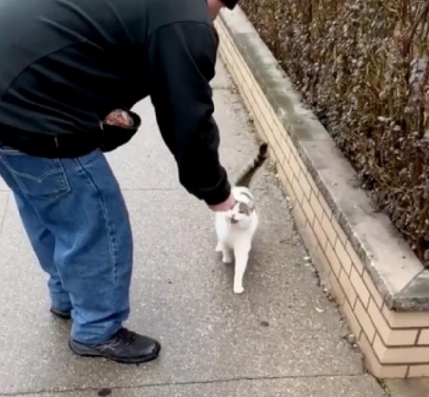 Όταν έφτασαν στο συνηθισμένο σημείο, η γάτα ήταν ήδη εκεί και τους περίμενε. Αμέσως ήρθε τρέχοντας, νιαουρίζοντας και χτυπώντας τους με το κεφάλι για χάδια και αγάπη.