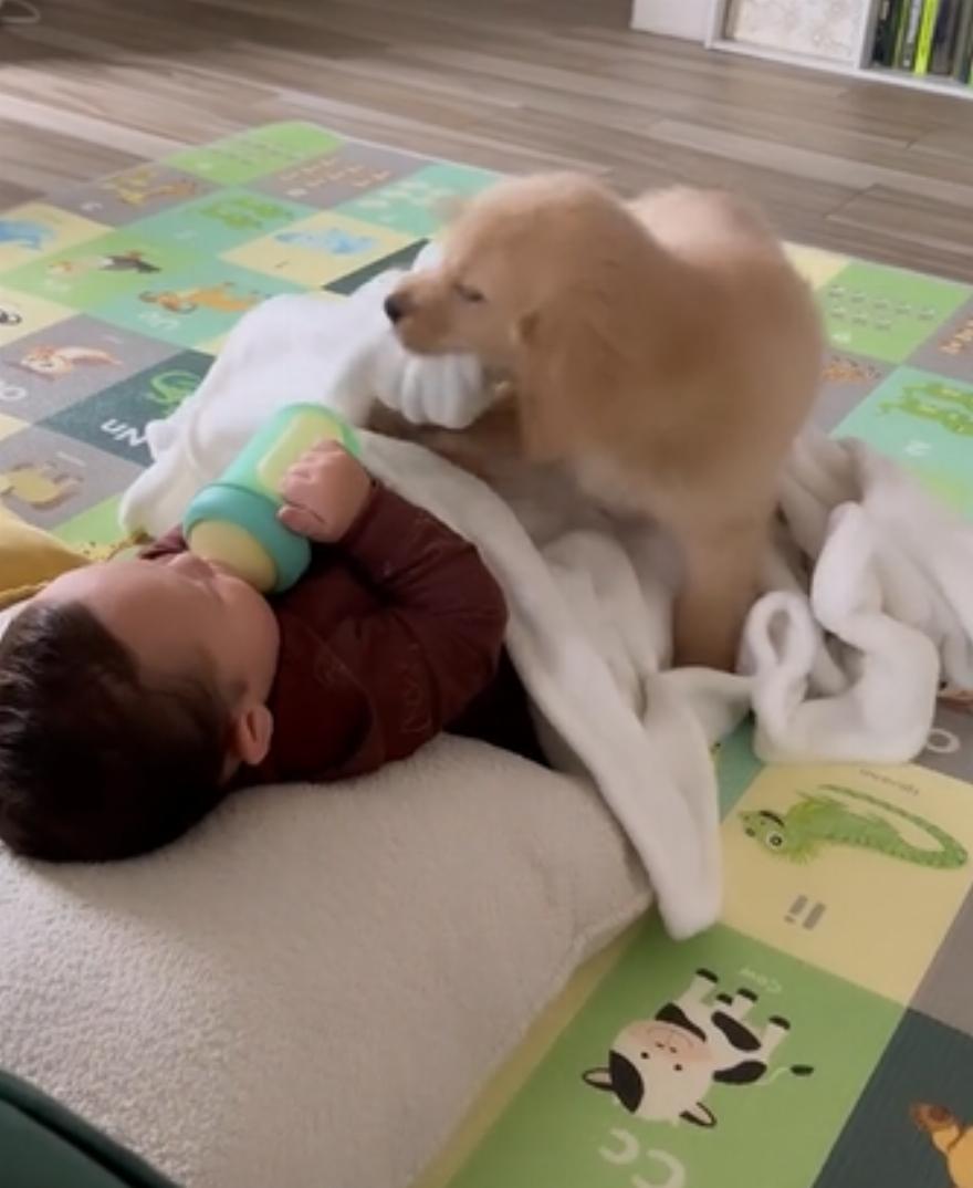 Αντί το παιδί να ακολουθεί τον σκύλο όπως βλέπουμε συνήθως, αυτό το κουτάβι αναζητούσε την αγάπη και τη στοργή του μικρού παιδιού. Το κουτάβι τράβηξε μια κουβέρτα ακριβώς δίπλα στον φίλο της. Ρίξτε μια ματιά!