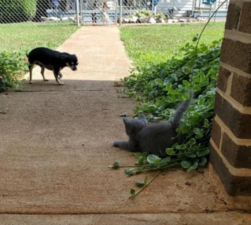 Η γατούλα συστήθηκε στον σκύλο φίλο της, τον Sammy, ο οποίος ήταν λίγο αβέβαιος στην αρχή, αλλά η ατρόμητη γατούλα ήταν ενθουσιασμένη και ήθελε απλώς να παίξει.