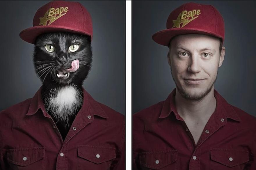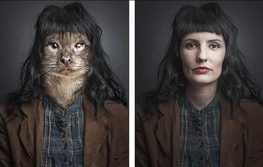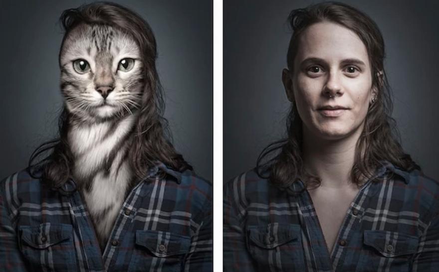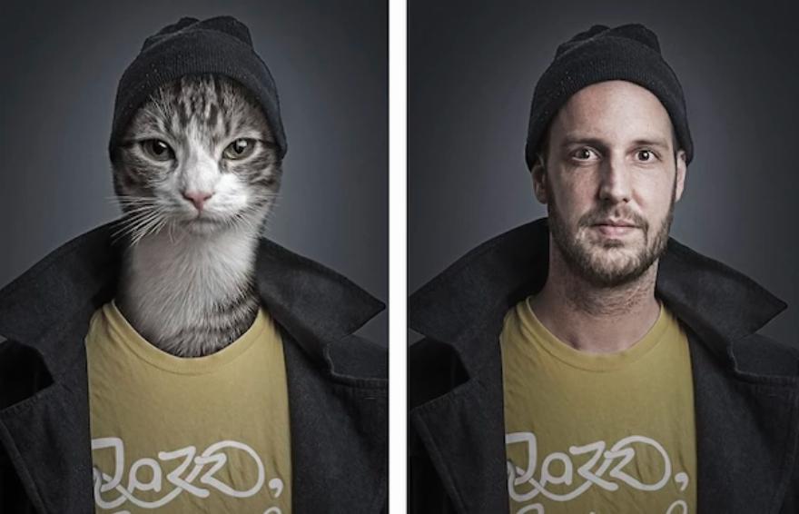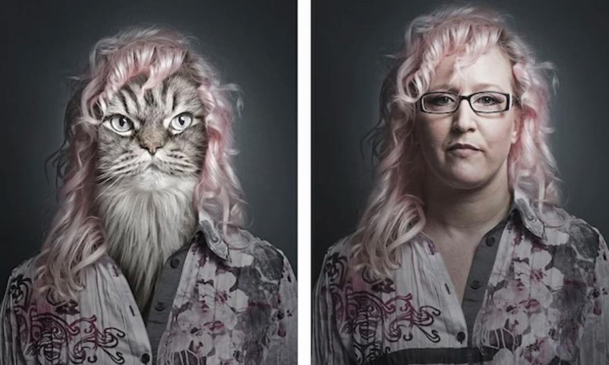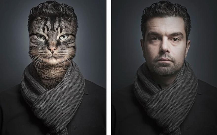 Μπορεί κάποιος να πει ότι λίγο πολύ το αποτέλεσμα είναι ανατριχιαστικό . Παλιότερα ο ίδιος φωτογράφος είχε κάνει με τον ίδιο τρόπο και μια σειρά φωτογραφιών παρόμοια με αυτή, μόνο που στη θέση της γάτας πυ ποζάρει δίπλα από το αφεντικό της υπήρχε σκύλος.