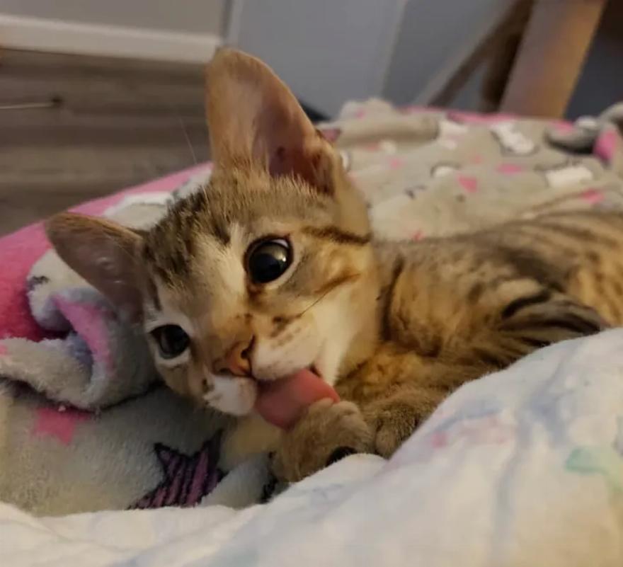 Μόλις ανακάλυψε μια μαλακή κουβέρτα, κουλουριαζόταν και γουργούριζε ασταμάτητα. “Η προσωπικότητά του άρχισε να φαίνεται. Ό,τι του λείπει σε μέγεθος, το αναπληρώνει με την ευγένειά του”, δήλωσε η Erin.