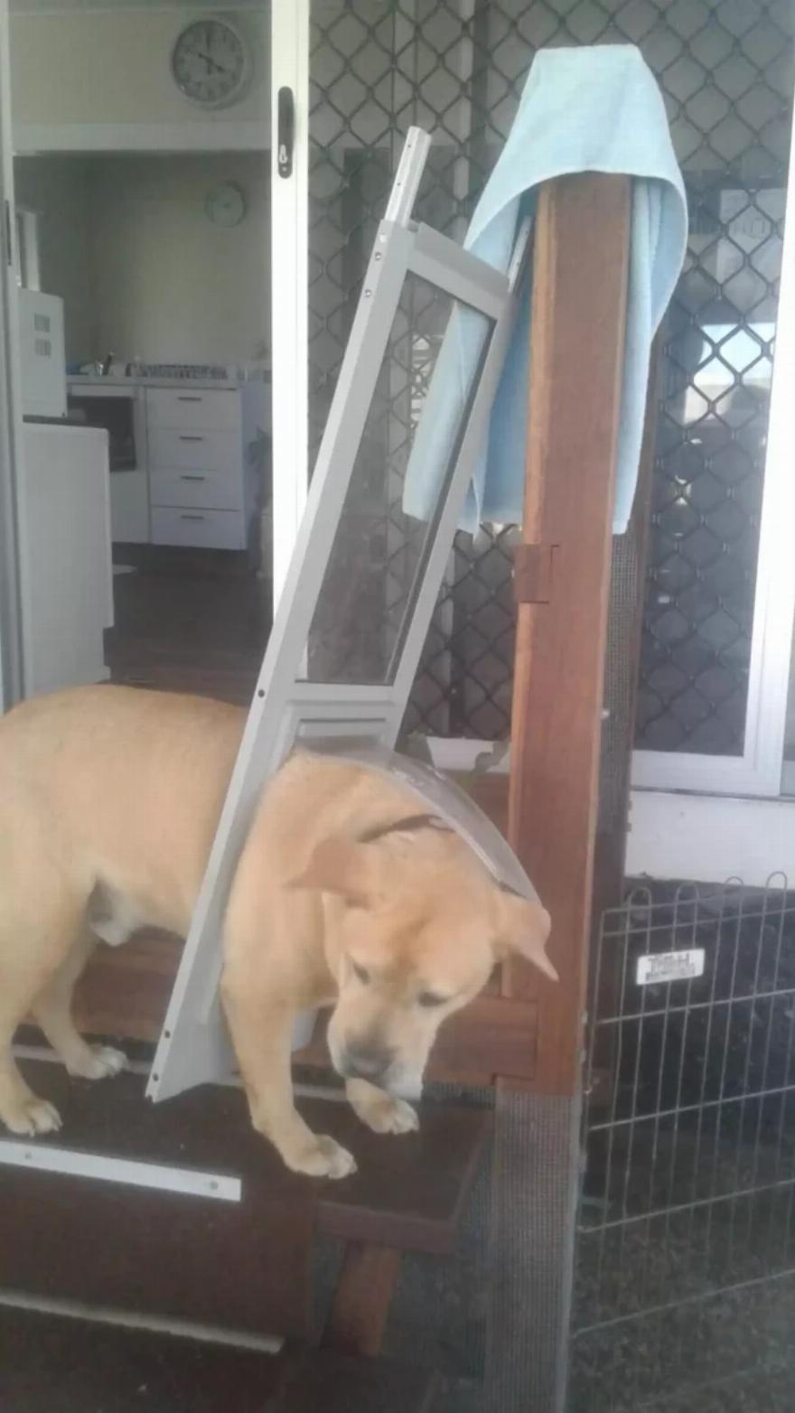 Αφού από σκύλος του δρόμου έγινε κακομαθημένο κουτάβι, είχε πάρει μερικά κιλά χωρίς να το καταλάβει. Και μετά από μια μέρα παιχνιδιού στην αυλή, ακολούθησε τα μικρότερα ξαδέρφια του από την πόρτα του σκύλου και κόλλησε.