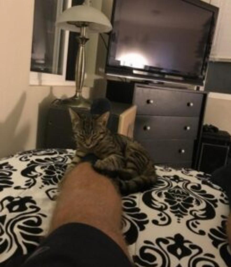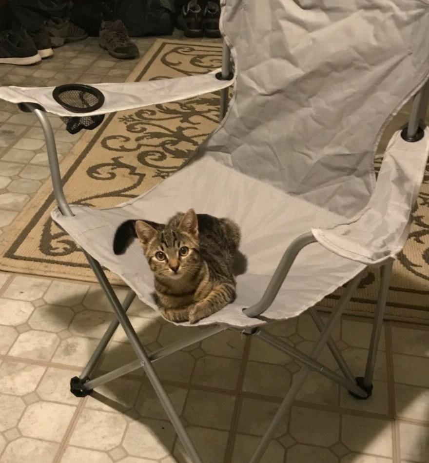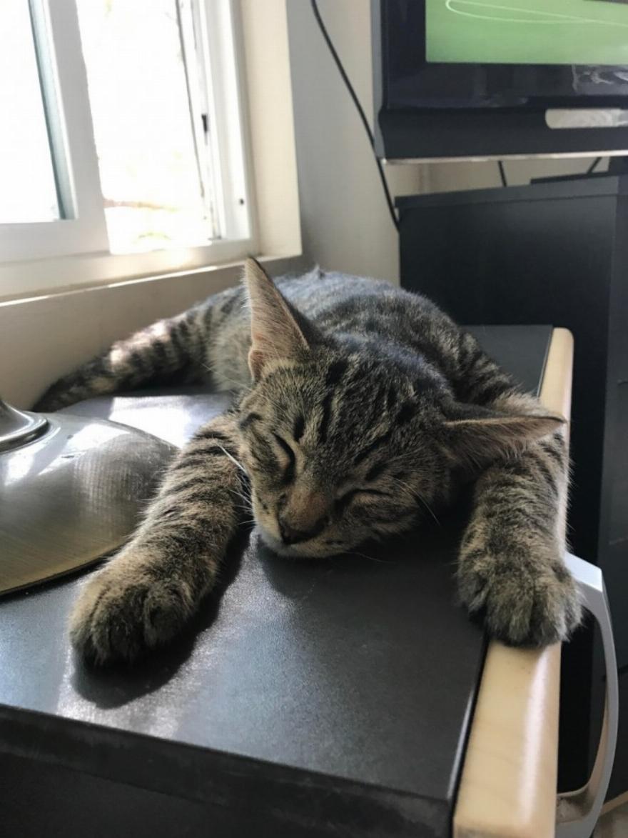 Μετά από μια μέρα δουλειάς, ο Νάιτζελ βρήκε το μικρό γατάκι να κοιμάται σε μια από τις καρέκλες . Θυμήθηκε ότι ένα από τα παράθυρα είχε μείνει ανοιχτό, οπότε θα ήταν η πόρτα εισόδου για το μικρό ζώο που έψαχνε ένα ανακουφιστικό μέρος για τον υπνάκο του.