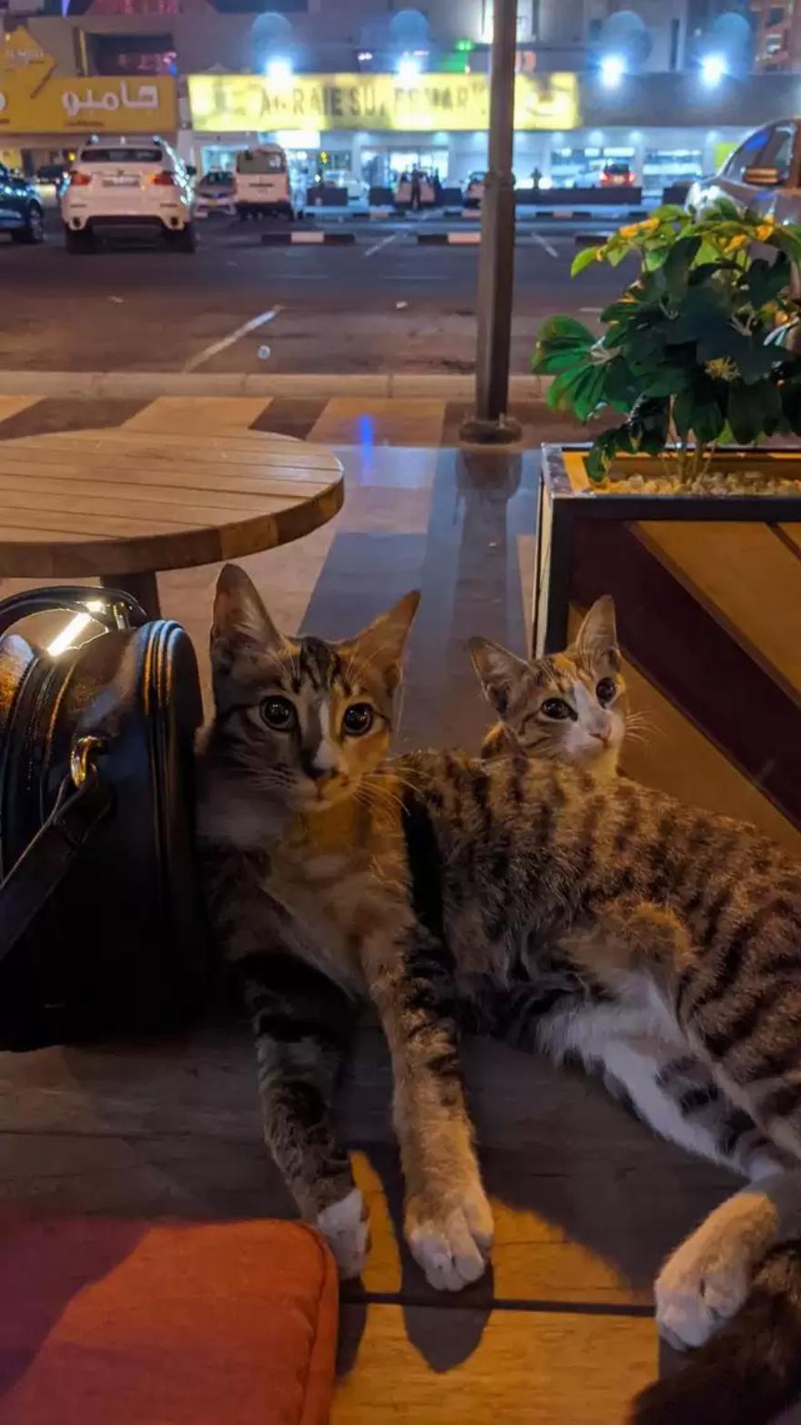 Δύο μικρές αδέσποτες αδελφές γατάκια απολάμβαναν επίσης το καφέ, με τις αναπαυτικές καρέκλες για να κοιμούνται και μια τέντα για να τα προστατεύει από τον ήλιο και τη βροχή.