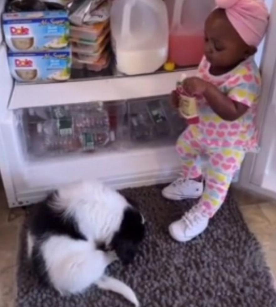 Το ψυγείο ήταν ορθάνοιχτο και οι δυο τους βρίσκονταν μπροστά και απλά χαλάρωναν καθώς έψαχναν για σνακ. Τη στιγμή που τους έπιασαν επ’ αυτοφώρω, ο μπαμπάς φώναξε “Πιάστηκαν!”. Το κοριτσάκι ρουφούσε αδιάφορα τον χυμό του, ενώ είχε οπτική επαφή με τον μπαμπά της. Το κουτάβι δίπλα της από την άλλη πλευρά προσπαθούσε ακόμα να ψάξει κάτι για τον εαυτό του.