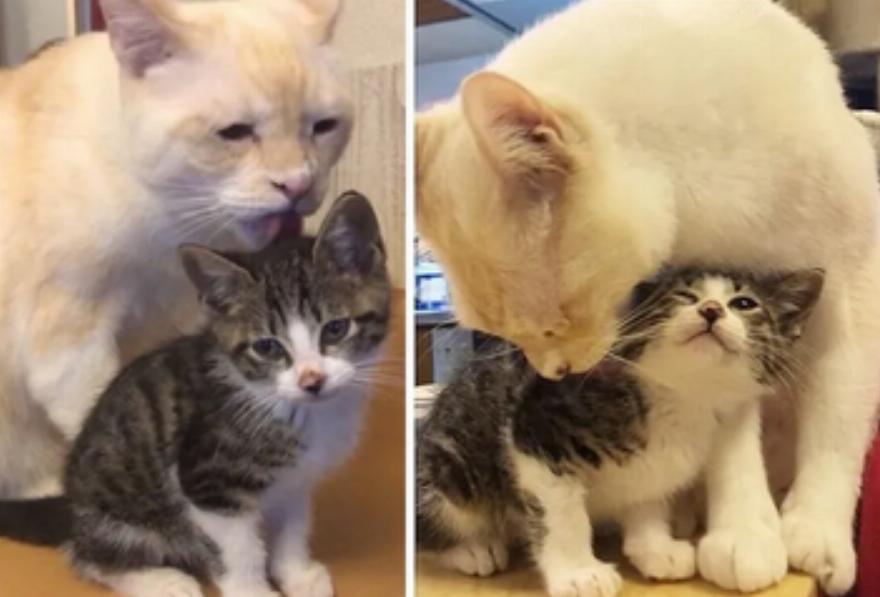 Περιττό να πούμε ότι ο Sol-kun πήρε τη μικρή νεοφερμένη υπό την προστασία του και άρχισε να την περιποιείται. Το tabby γατάκι ήταν λίγο αβέβαιο στην αρχή γι’ αυτό το μεγάλο γατάκι που ήταν τριπλάσιο σε μέγεθος, αλλά γρήγορα την κέρδισε η περιποιητική του φύση και τον πλησίασε για λίγη επιπλέον φροντίδα.