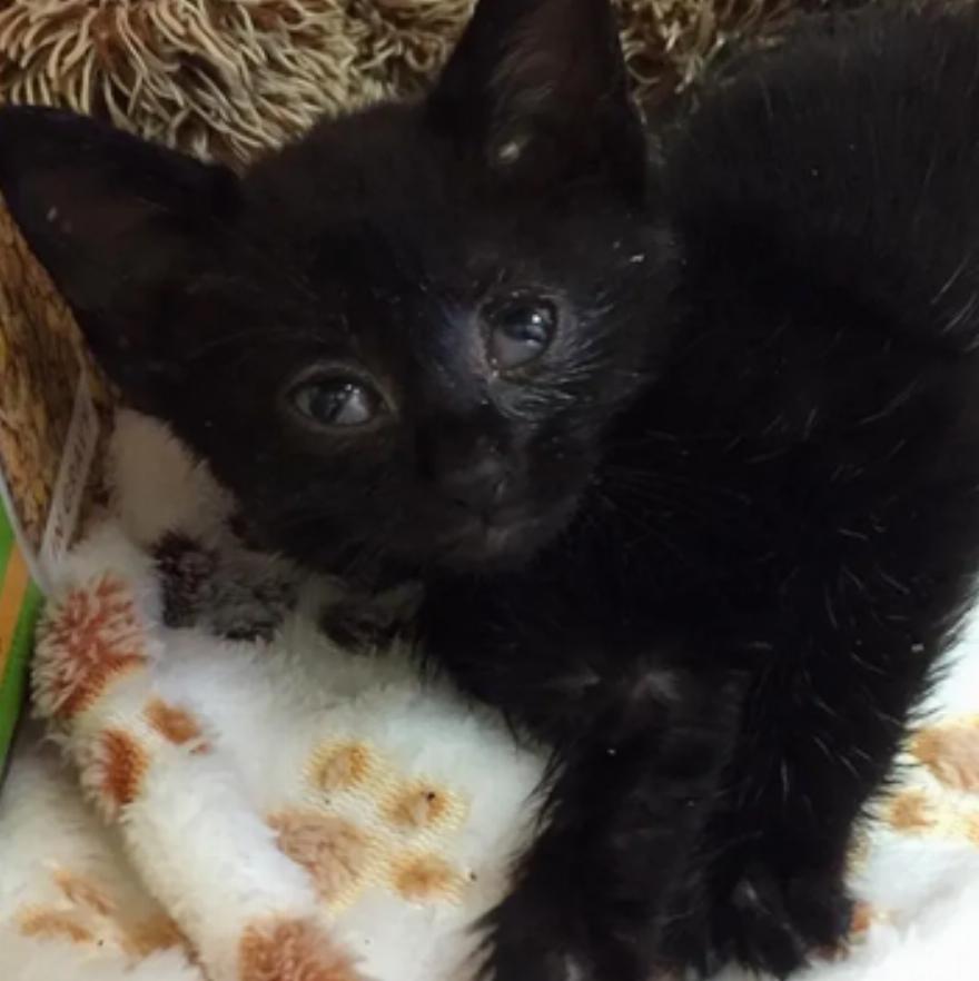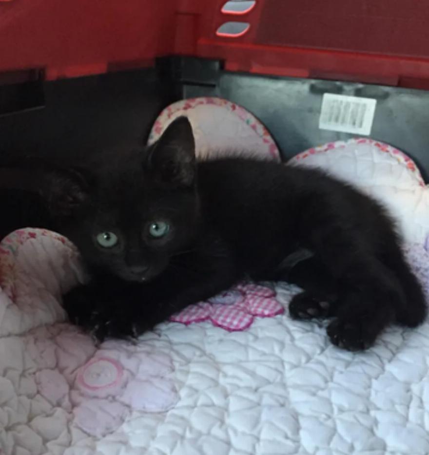 Ενώ βρισκόταν εκεί είδε ένα μικροσκοπικό μαύρο γατάκι που βρισκόταν κοντά σε κάδους απορριμμάτων στο πίσω μέρος ενός σπιτιού. Όταν πλησίασε πιο κοντά, παρατήρησε ότι χρειαζόταν ιατρική φροντίδα.