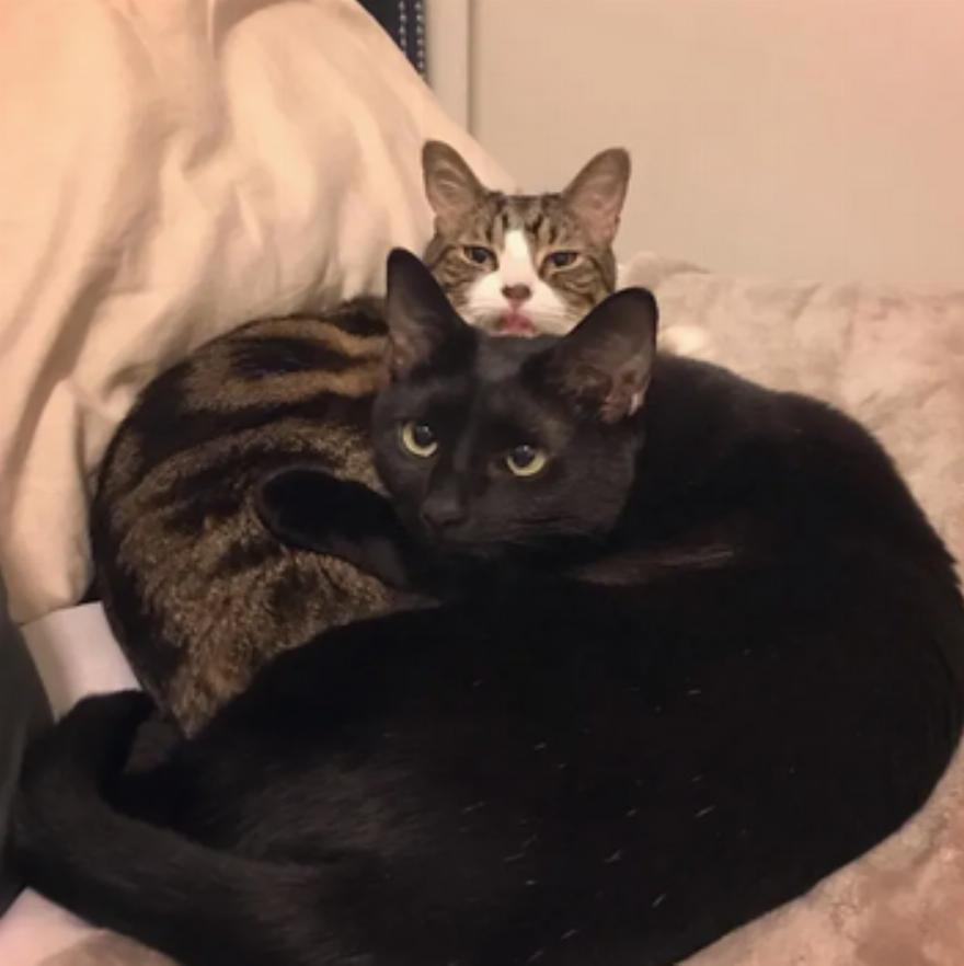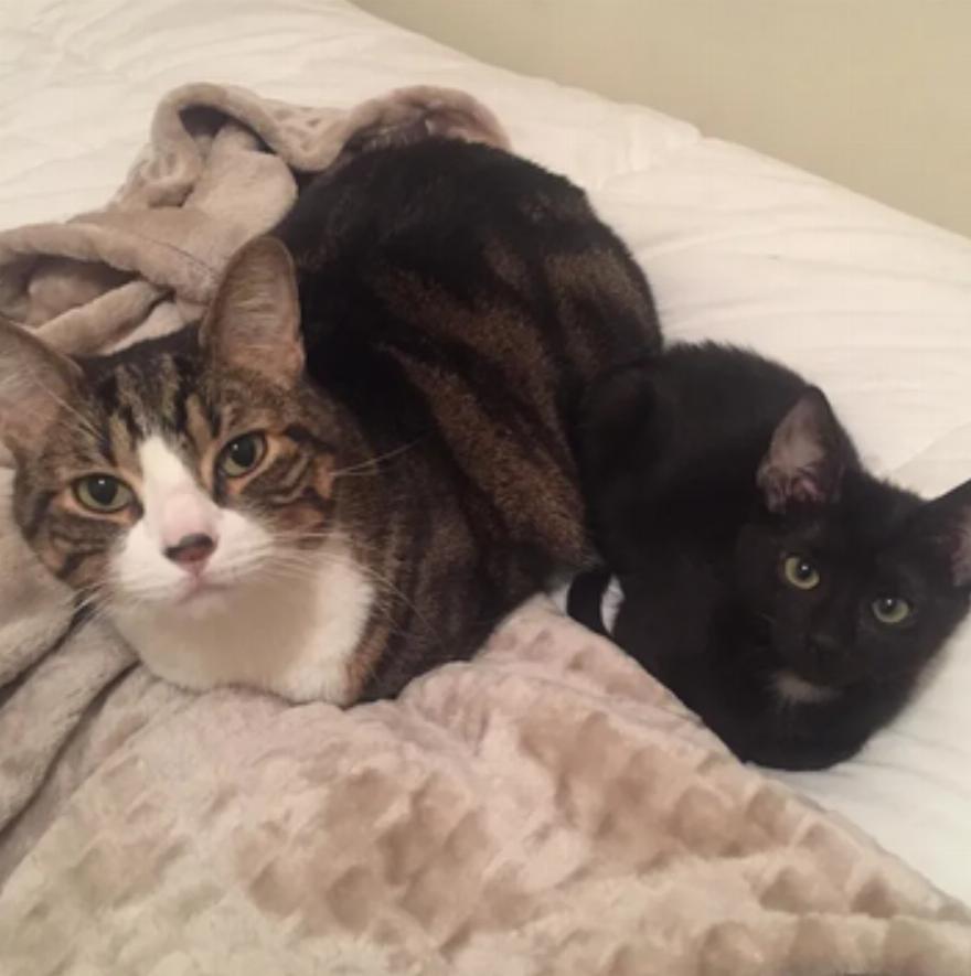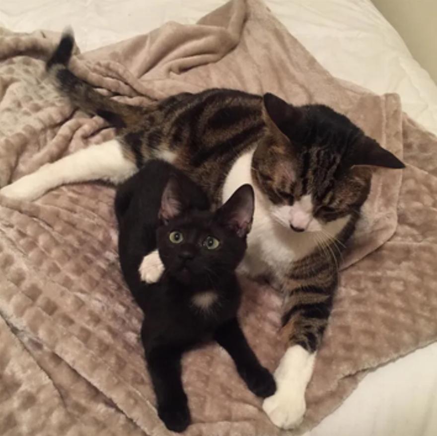 Μετά από λίγη πάλη και ένα μπάνιο, η Lulu χουχουλιάζει δίπλα από τον Mojo και γουργουρίζει μέχρι να κοιμηθεί.