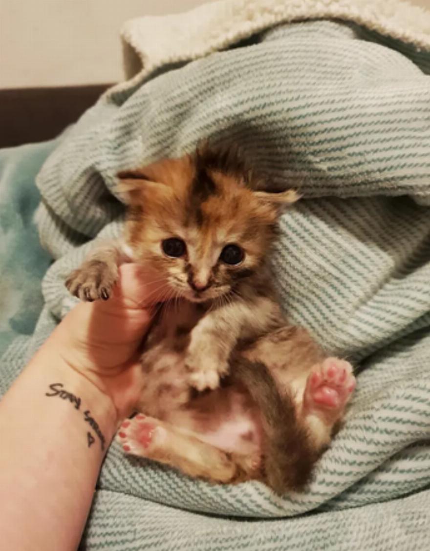 Σε ηλικία λίγων ημερών, το μικροσκοπικό calico πάλευε με μια λοίμωξη στον ομφάλιο λώρο. Η Katerina δούλευε νυχθημερόν για να την ταΐσει και να τη βοηθήσει να δυναμώσει.
