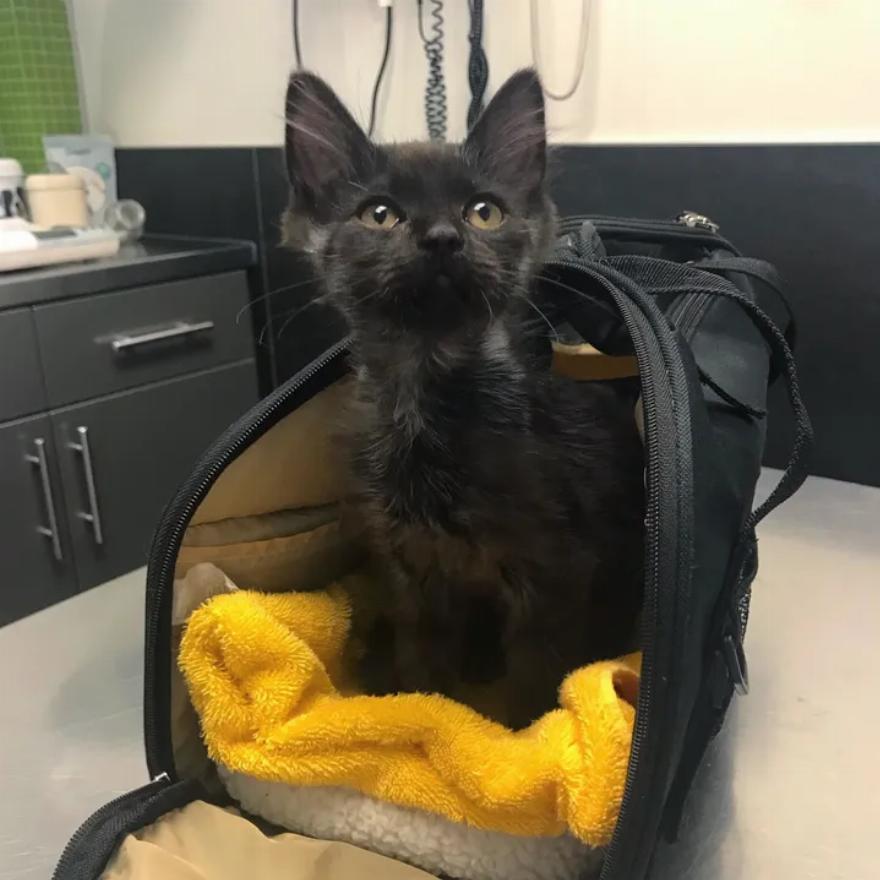 Το γατάκι μεταφέρθηκε στον κτηνίατρο όπου του δόθηκαν αντιβιοτικά, υγρά και ειδική φροντίδα για τα μάτια. Παρά το γεγονός ότι ήταν πολύ εύθραυστο, ήταν ευγνώμων και γουργούριζε όλη την ώρα.