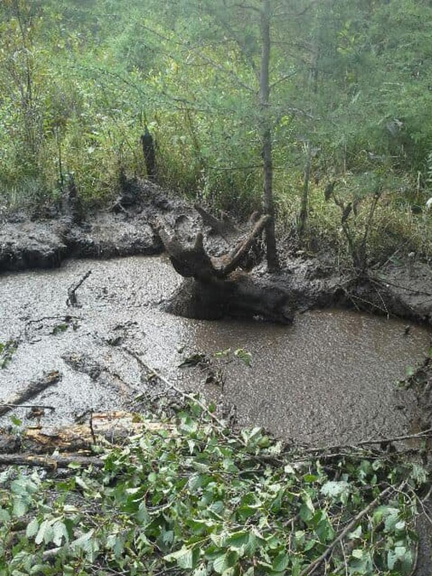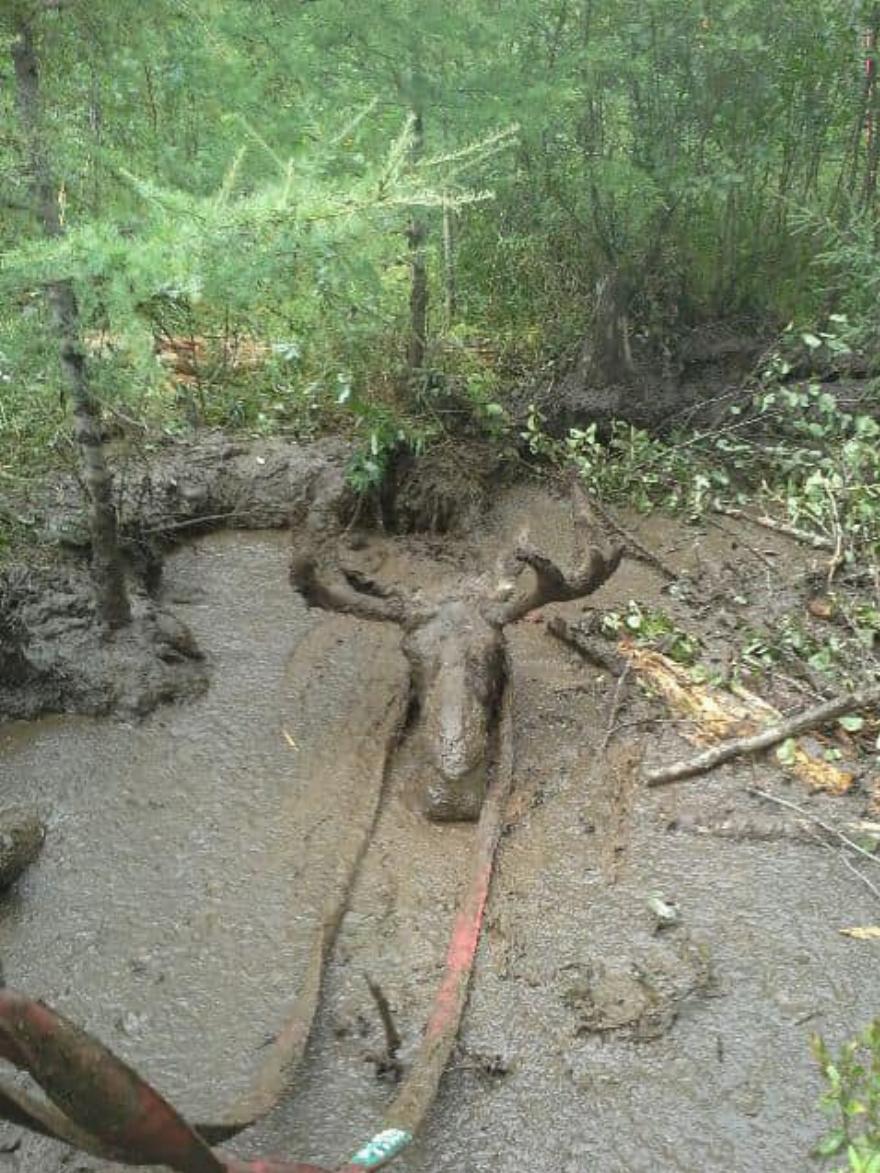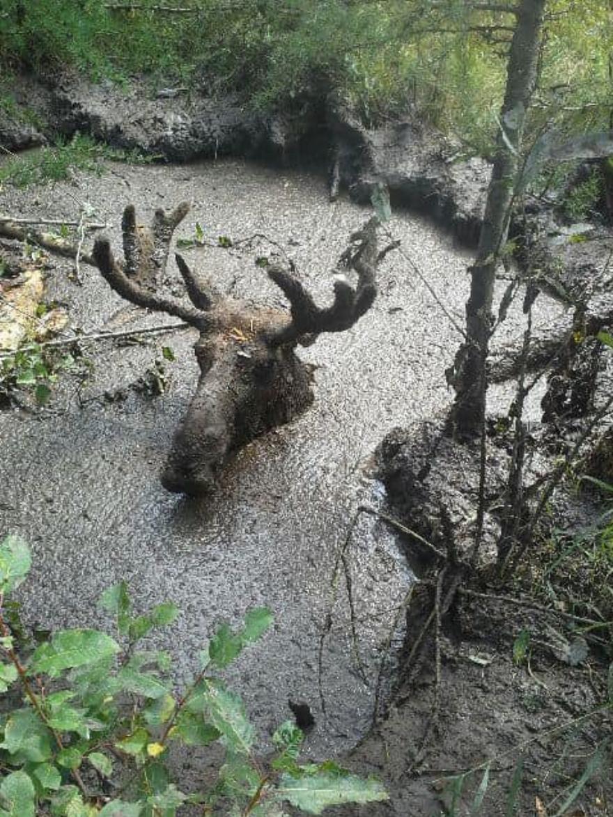 Οι δύο άνδρες πληροφορήθηκαν ότι μια άλκη είχε κολλήσει στη λάσπη στο δάσος κοντά στην πόλη Timmons του βορειοανατολικού Οντάριο στον Καναδά, όπου ζουν. Το κεφάλι ήταν το μόνο μέρος της που παρέμενε πάνω από την επιφάνεια της λασπωμένης τρύπας.