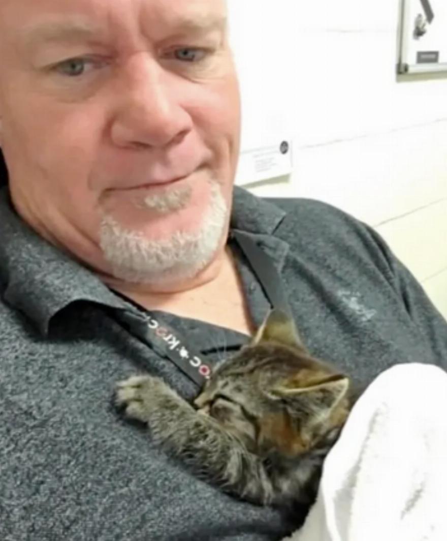 Στο δρόμο για το σπίτι, το γατάκι κουλουριάστηκε στην αγκαλιά του και κοιμήθηκε αμέσως