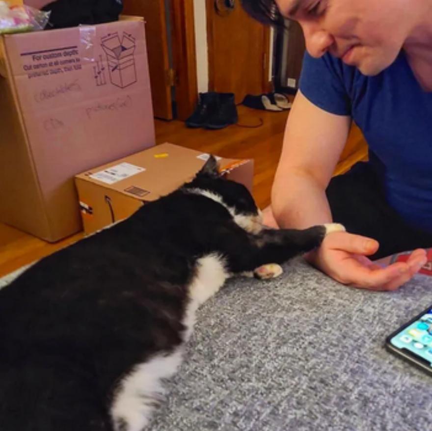 Ο γάτος μπορούσε επιτέλους να χαλαρώσει και να απολαύσει το να είναι μια οικόσιτη γάτα. Όταν μετακόμισε με έναν άλλο ανάδοχο εθελοντή, τον Jeff, το σμόκιν αγόρι ήταν αποφασισμένο να τον κερδίσει.