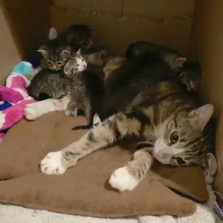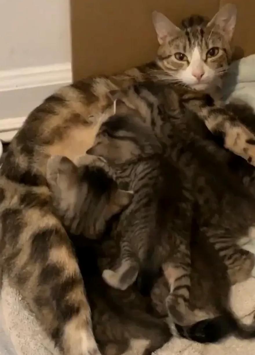 Η μαμά γάτα είναι τόσο ευτυχισμένη που έχει μια στέγη στο κεφάλι τους και ευγενικούς ανθρώπους που θα βοηθήσουν να μεγαλώσει τα γατάκια της.