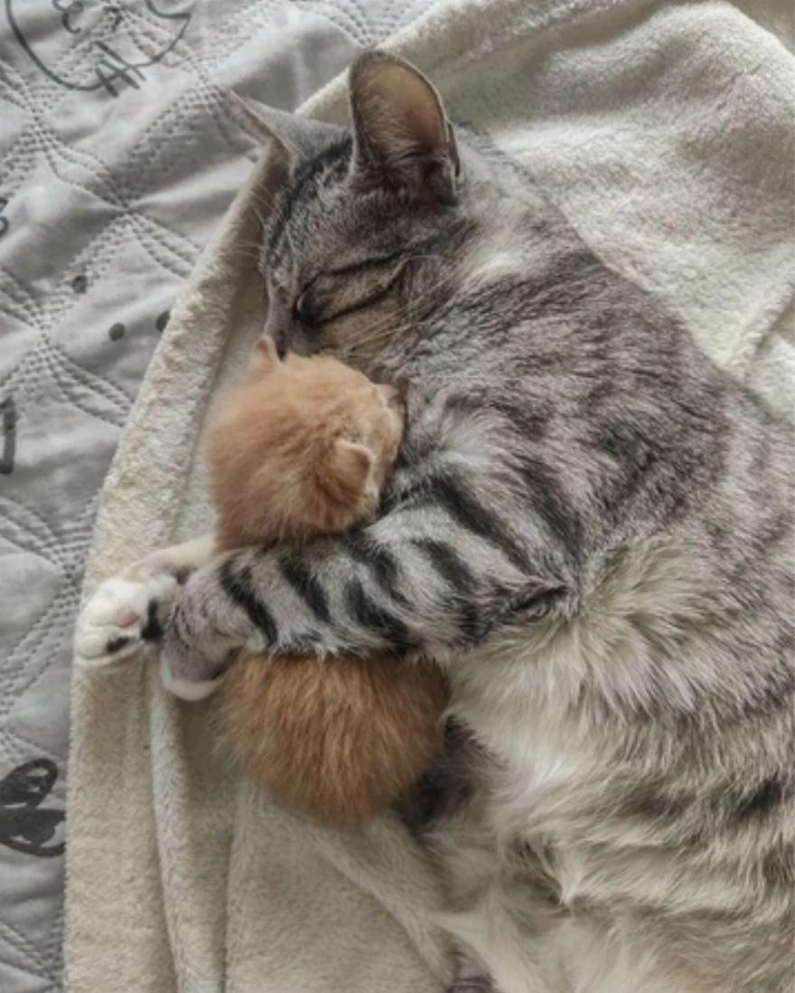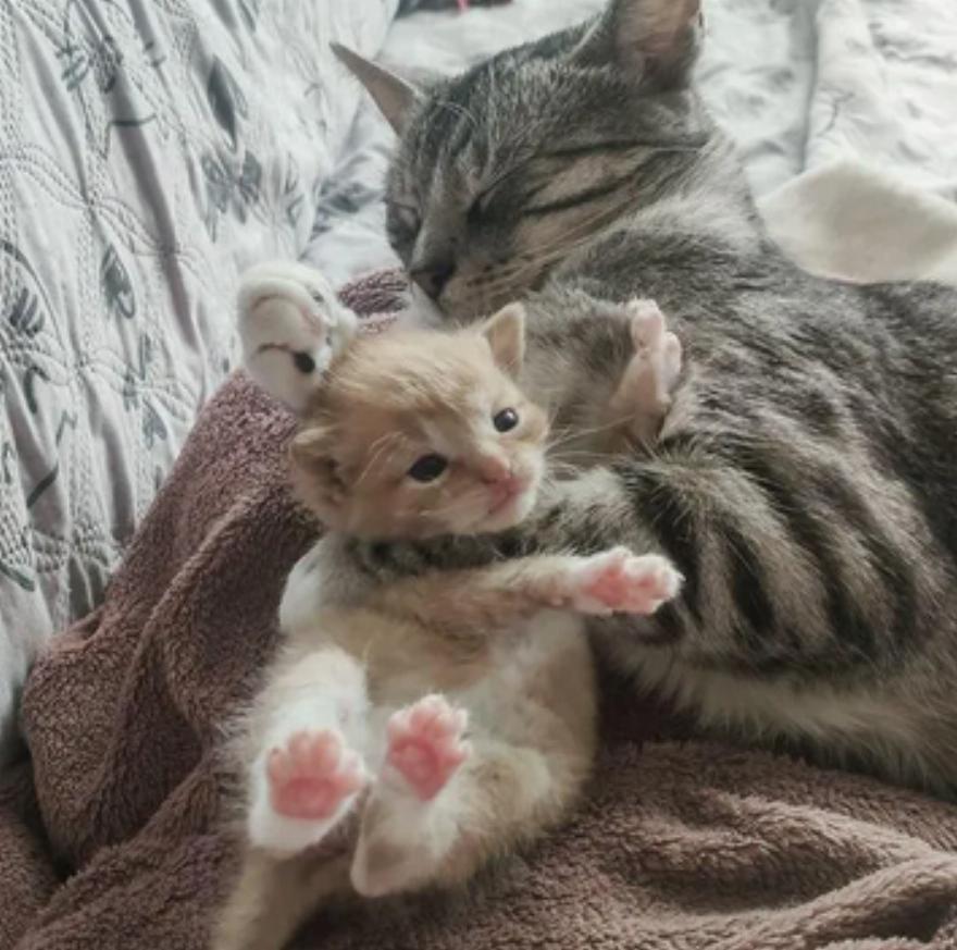 Ως διασωθείσα και η ίδια, η Malaika έχει αδυναμία στα γατάκια που έχουν ανάγκη. Τον αγκάλιαζε και τον έπλενε από το κεφάλι μέχρι την ουρά.