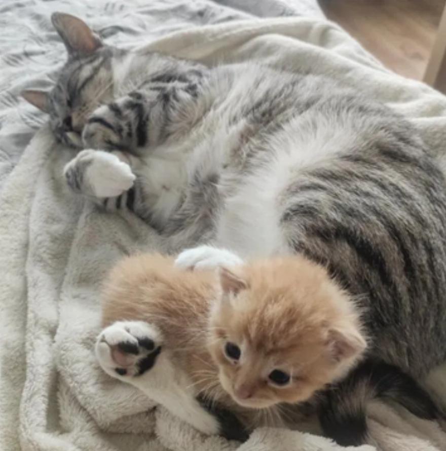 Η γλυκιά γάτα άκουσε τα νιαουρίσματα του γατιού και ήρθε τρέχοντας