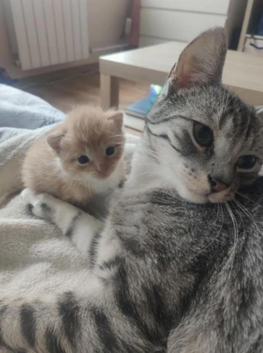 Η γλυκιά γάτα άκουσε τα νιαουρίσματα του γατιού και ήρθε τρέχοντας