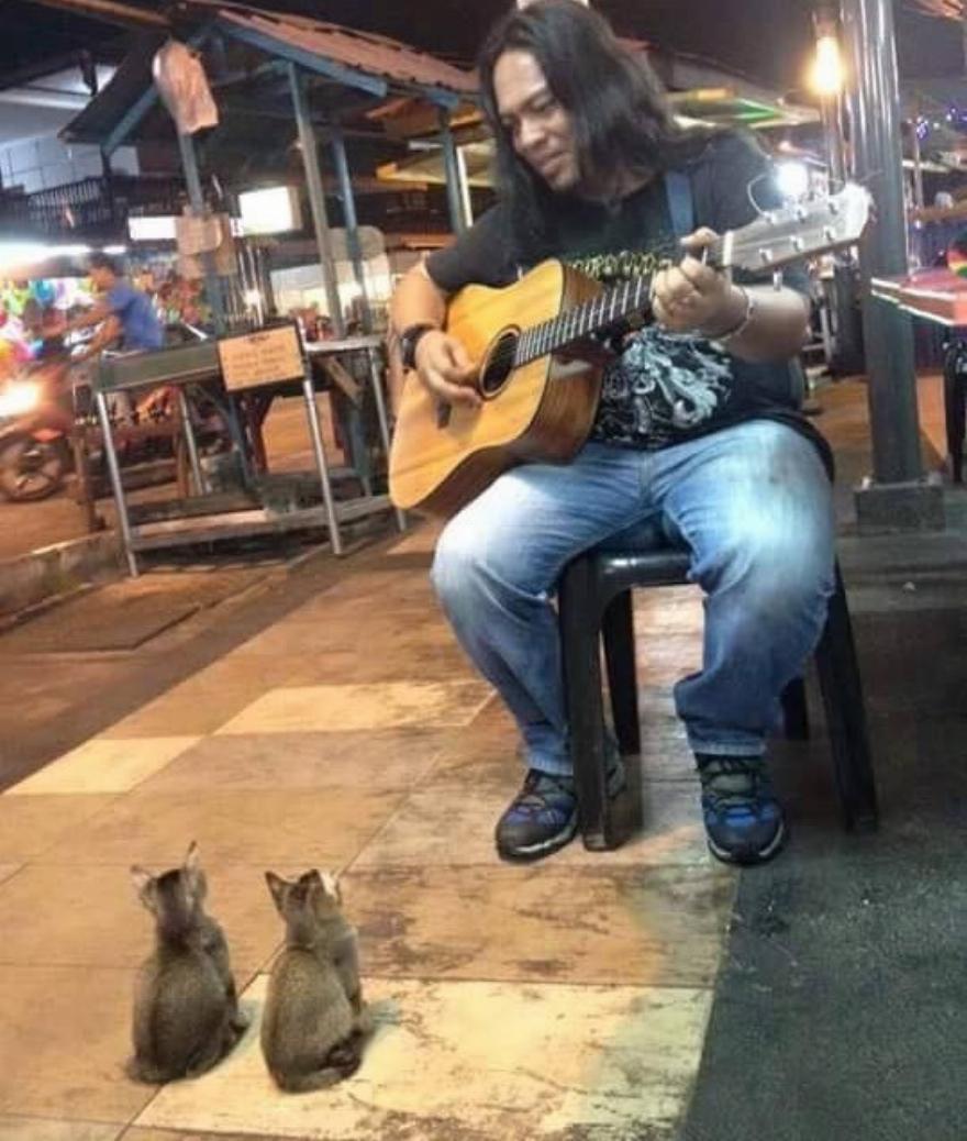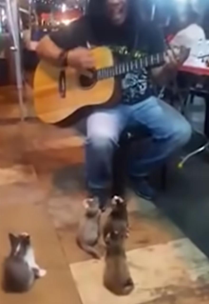 Παρά το γεγονός ότι αισθανόταν πεσμένος επειδή δεν έβγαλε πολλά χρήματα εκείνη την ημέρα, ο άντρας είχε αποφασίσει να τραγουδήσει ένα τελευταίο τραγούδι για πλάκα. Κατά ειρωνικό τρόπο, καθώς ο άνδρας χαλαρώνει και αποφασίζει να σταματήσει να ανησυχεί για τα χρήματα, τότε είναι που αρχίζει να εμφανίζεται το κοινό του! Τα γατάκια, που είναι μόλις τριών μηνών, δεν έχουν μάλλον ακούσει ποτέ ξανά τον θόρυβο μιας κιθάρας και είναι ενθουσιασμένα από την κίνηση του χεριού του άντρα καθώς παίζει τις χορδές της κιθάρας.