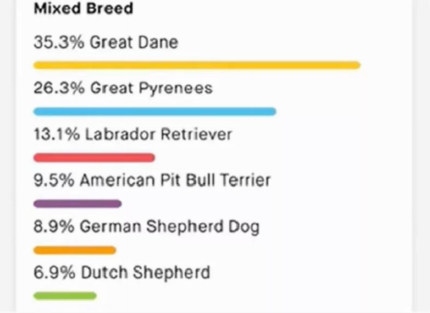 Αποδεικνύεται ότι το καταφύγιο ζώων δεν έλεγε ψέματα για τη ράτσα, καθώς είναι 13% λαμπραντόρ ριτρίβερ. Αλλά είναι κυρίως Great Dane και Great Pyrenees και λιγότερο από 10 τοις εκατό American pit bull terrier, γερμανικός ποιμενικός και ολλανδικός ποιμενικός.