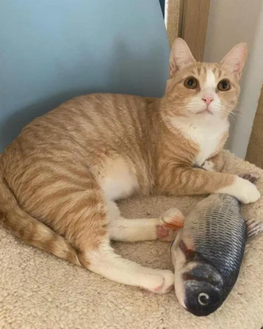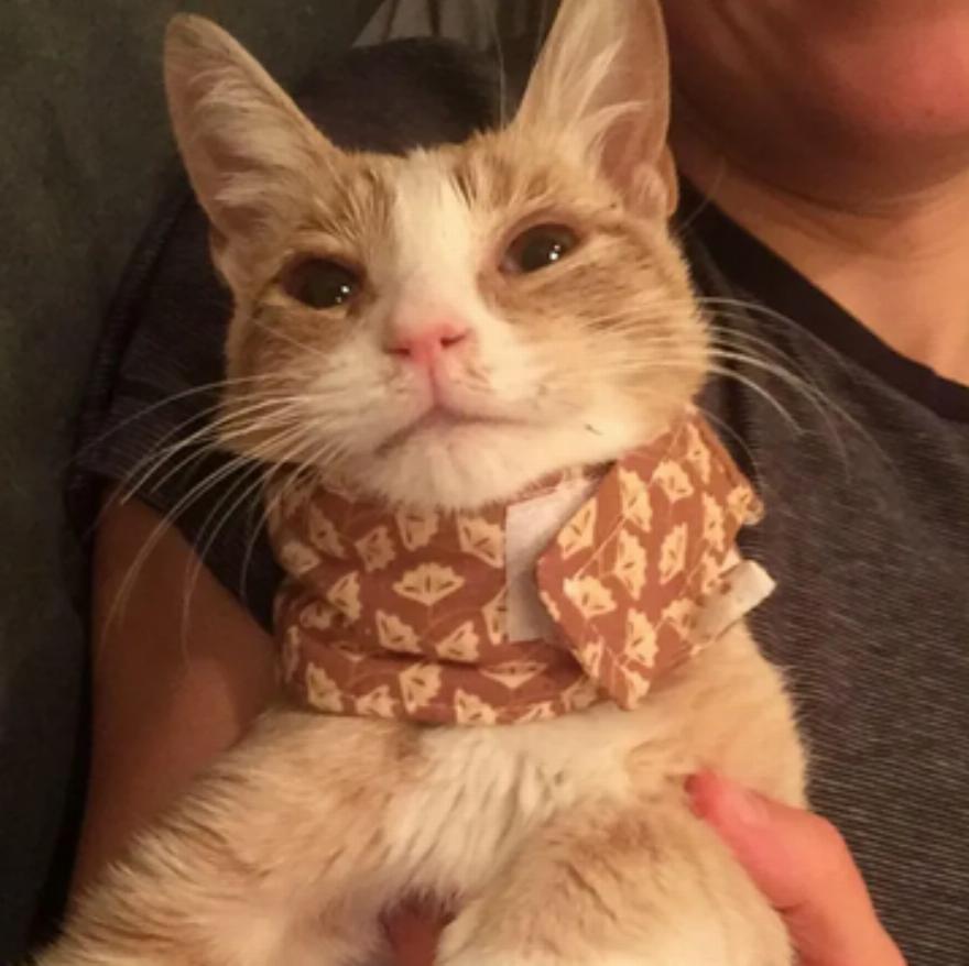 Το γατάκι εκτιμάται ότι ήταν οκτώ μηνών, πολύ λιποβαρές και είχε σοβαρή λοίμωξη του ανώτερου αναπνευστικού. Παρά το γεγονός ότι ήταν πολύ αδύναμο, ήταν πρόθυμο για προσοχή και προσπαθούσε να σηκώσει το κεφάλι του για τα κατοικίδια.