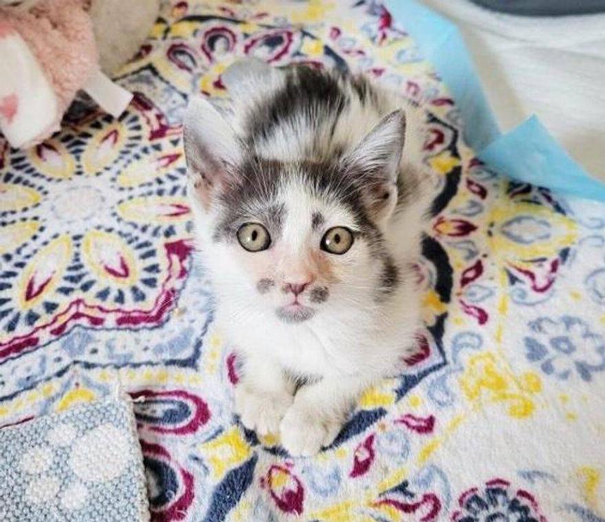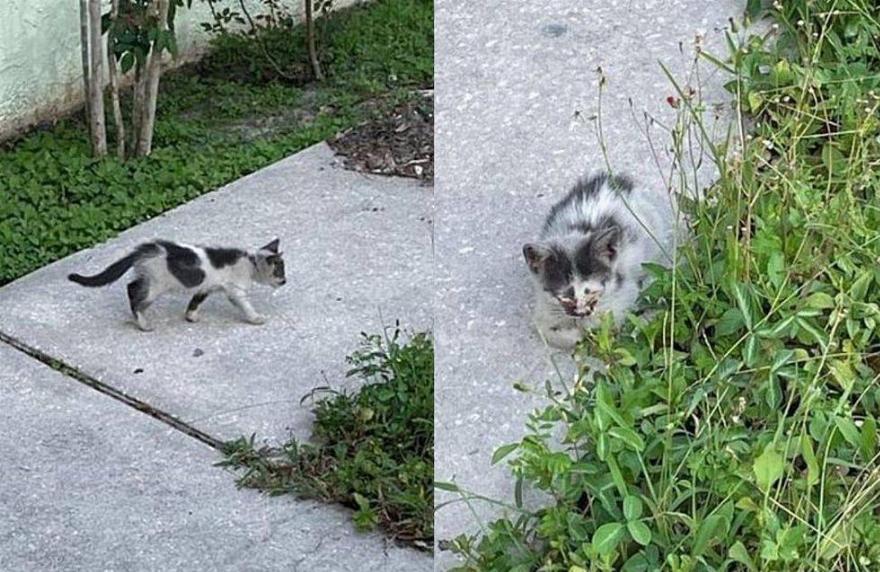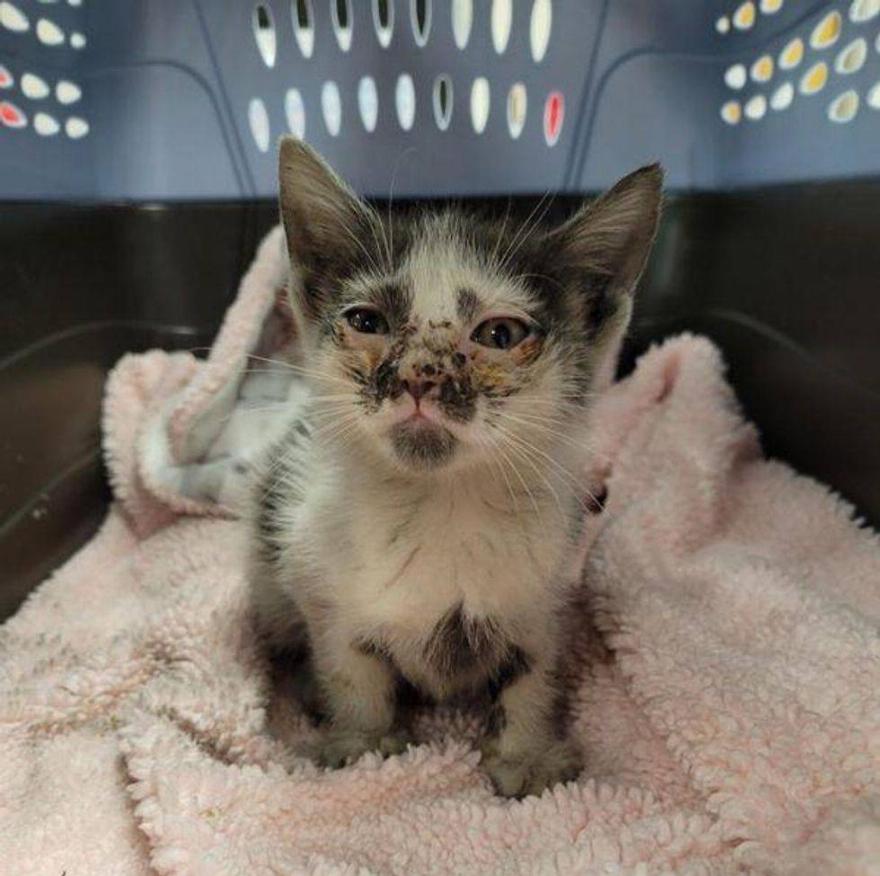 Μια διασώστρια ζώων και ανάδοχος αγάπησε αστραπιαία ένα γατάκι που περιφερόταν γύρω από το σπίτι ενός κατοίκου. Το μικρό αδέσποτο ήταν μόνο δέρμα και κόκαλα και το πρόσωπό του ήταν καλυμμένο με κρούστα.