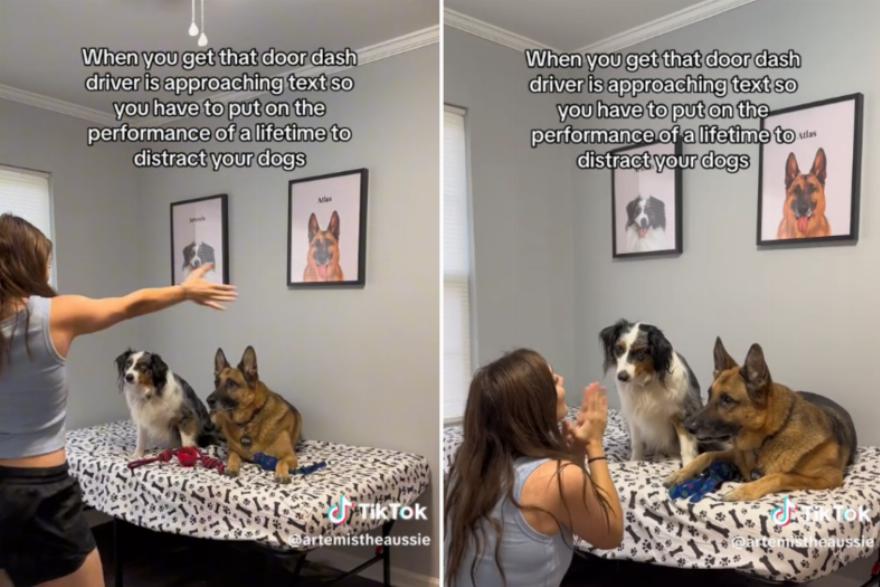Αφού παρήγγειλε Taco Bell μέσω Doordash, η TikToker Dylan Mansour ήξερε ότι θα έπρεπε να κρατήσει τα σκυλιά της -τον αυστραλιανό ποιμενικό Artemis και τον γερμανικό ποιμενικό Atlas– απασχολημένα για να τα σταματήσει από το να ταλαιπωρούν τον διανομέα.