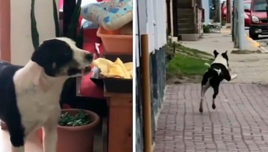 Νομίζοντας ότι δεν τον παρακολουθεί κανείς, ο σκύλος άρπαξε το φαγητό και έφυγε τρέχοντας, χαρούμενος, για να το φάει ήσυχος σε άλλη τοποθεσία. Ο ιδιοκτήτης του σκύλου, ωστόσο, γνώριζε την κλοπή και κατέγραψε την αστεία συμπεριφορά του κατοικίδιου του.