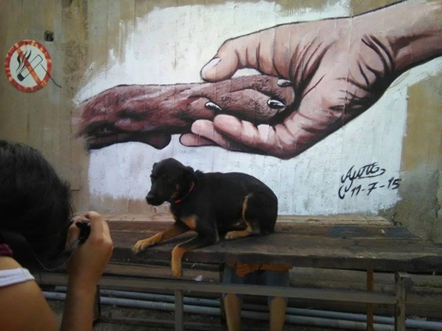 Με φόντο το γκράφιτι του Άμπε Φερέιρα, τρεις εθελοντές -η Νάνσυ, η Αγγελική και οΓιάννης- φωτογράφισαν σε αυθόρμητες πόζες τα ζώα του καταφυγίου, ώστε να αυξηθούν οι πιθανότητες τους για υιοθεσία.