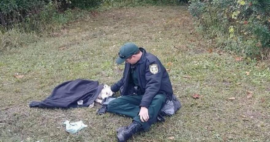 Ο αστυνομικός φρόντισε τον σκύλο μετά το περιστατικό και ένας περαστικός τον έβγαλε φωτογραφία όταν είδε την καλόκαρδη πράξη του.