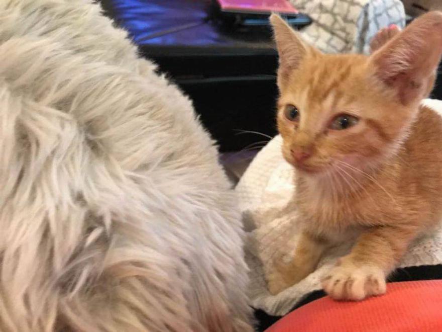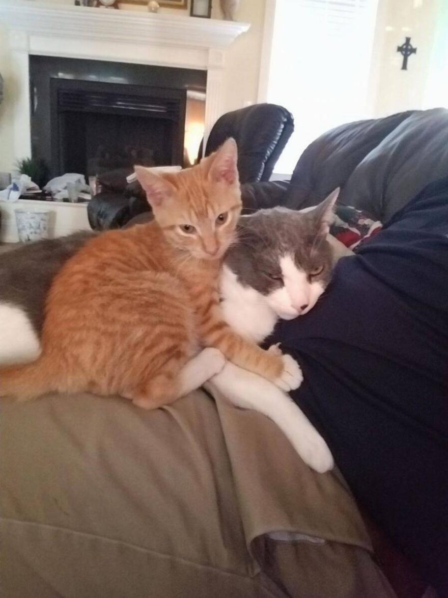 Ο γάτος της οικογένειάς τους, ο Toby, ο οποίος είναι επίσης διασωθείς, έχει συμπαθήσει το μικρό γατάκι.