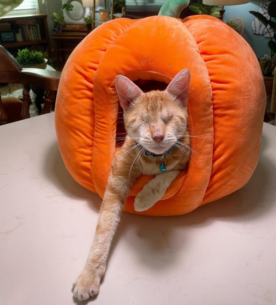 Μας λέει ότι: “Είναι ένα τόσο στοργικό και γεμάτο αυτοπεποίθηση γατάκι. Τον κράτησα στο μπάνιο μερικές μέρες για να εγκλιματιστεί στο σπίτι μου, αλλά δεν άργησε να θέλει να εξερευνήσει. Κυκλοφορεί αρκετά καλά και ήδη αναγνωρίζει τον ήχο της φωνής μου και καταλαβαίνει τη διάταξη του σπιτιού μου”.
