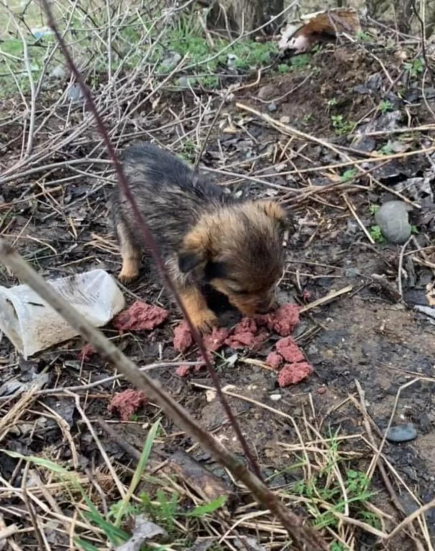 Το σκυλάκι ζούσε κοντά σε έναν σωρό σκουπιδιών, χρησιμοποιώντας μια παλιά μπότα για να προστατευτεί από τα στοιχεία της φύσης. Το κουτάβι ήταν πολύ μικρό για να είναι χωρίς μαμά, αλλά η Marinkovic δεν μπορούσε να βρει άλλα σκυλιά κοντά.