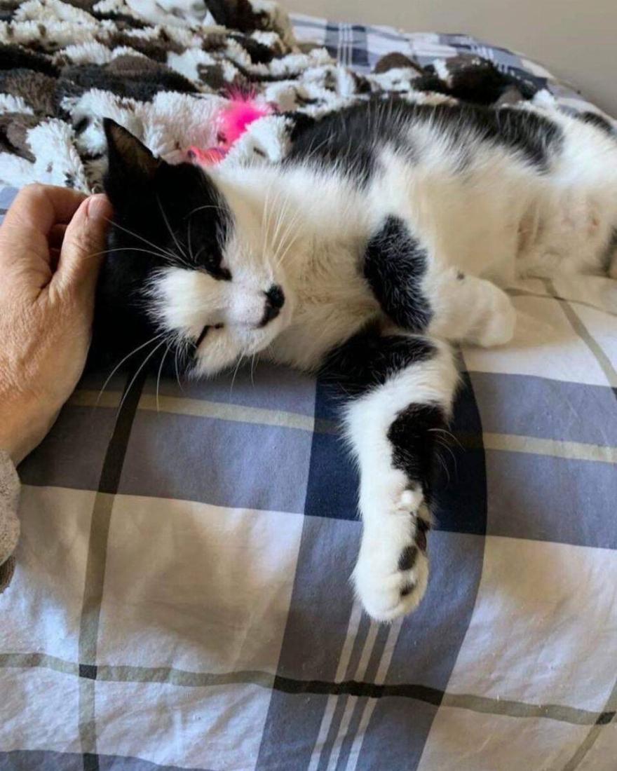 Η γάτα είχε μολυσμένες πληγές που κάλυπταν το στήθος και το λαιμό της. Πιθανότατα είχε εγκαταλειφθεί και παραμεληθεί για αρκετό καιρό. Οι άνθρωποι που την βρήκαν την πήραν στο σπίτι τους, την περιποιήθηκαν για να γίνει πάλι υγιής και της έδωσαν μια άνετη φωλιά όπου γέννησε πέντε υγιή γατάκια.