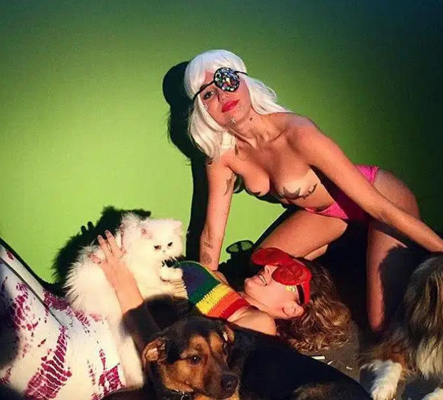 Στη συνέχεια , πόζαρε και σε ακόμα μία στάση: καθισμένη στα γόνατα, με μία γάτα, δύο σκυλάκια κι ένα μοντέλο, ενώ -ως άτακτη πειρατίνα- είχε καλυμμένο το ένα μάτι της. «Ελάτε να σπάσουμε το ίντερνετ, έρχονται κι άλλα σύντομα» έγραψε στη λεζάντα.