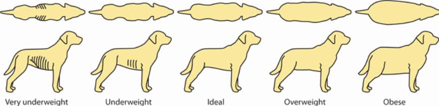 Ως πρόχειρος οδηγός, ρίξτε μια ματιά στην παρακάτω κλίμακα για να δείτε αν ο σκύλος σας μπορεί να είναι υπέρβαρος. Ιδανικά, όταν κοιτάζετε από ψηλά, θα πρέπει να υπάρχει σαφής γραμμή μέσης και όταν κοιτάζετε από το πλάι, η κοιλιά θα πρέπει να είναι τεντωμένη προς τα πίσω πόδια. Θα πρέπει να μπορείτε να αισθάνεστε εύκολα τα δύο τελευταία πλευρά. Αν έχετε αμφιβολίες, μπορείτε πάντα να ρωτήσετε τον κτηνίατρό σας.